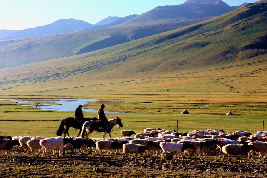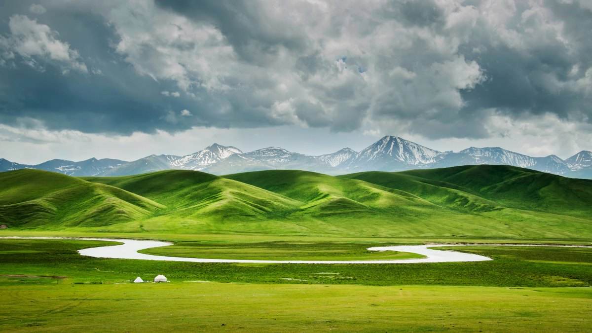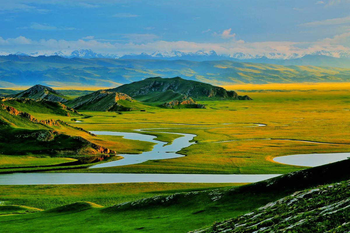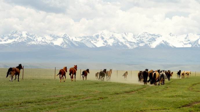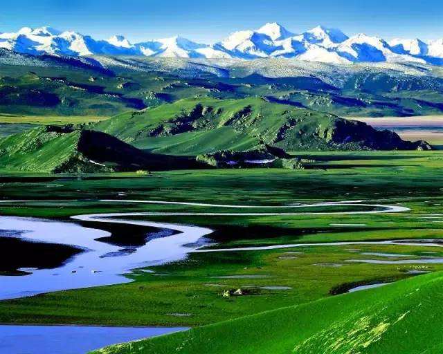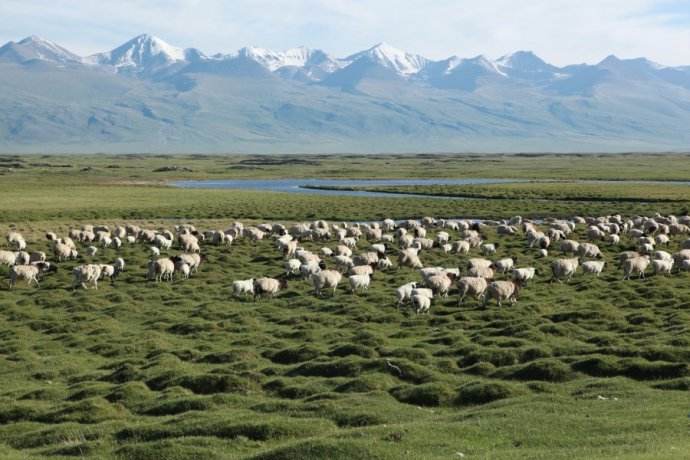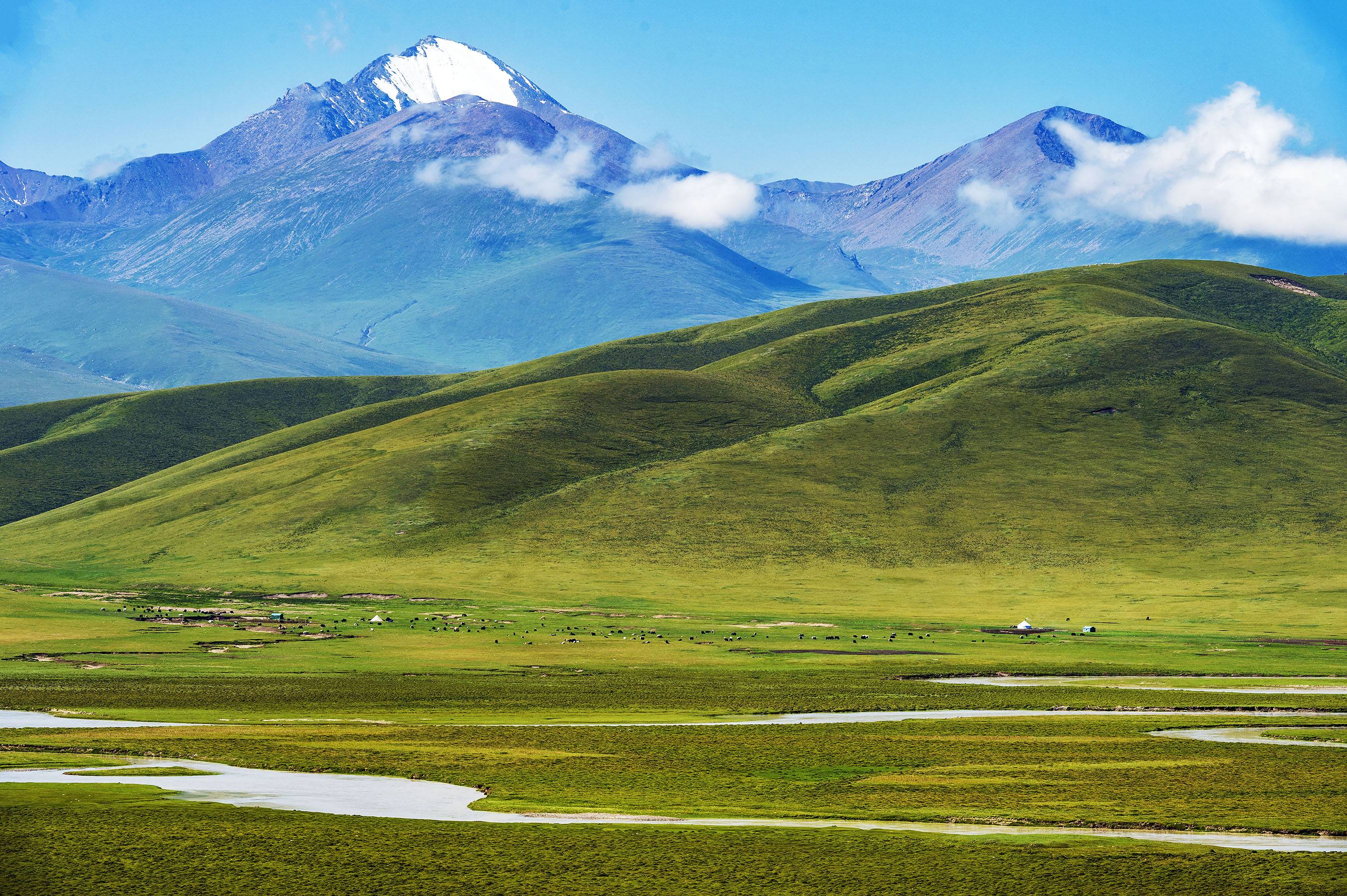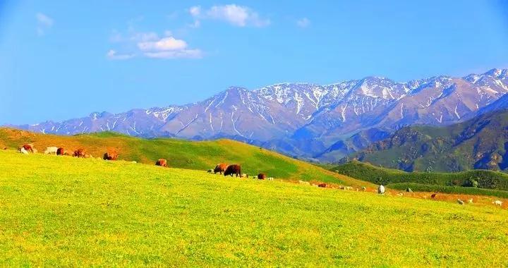 天山是亞洲最偉大的山脈之一,近處草原綠意盎然,牛羊成群,遠(yuǎn)處山峰綿延,通體覆蓋著皚皚白雪,神秘圣潔。