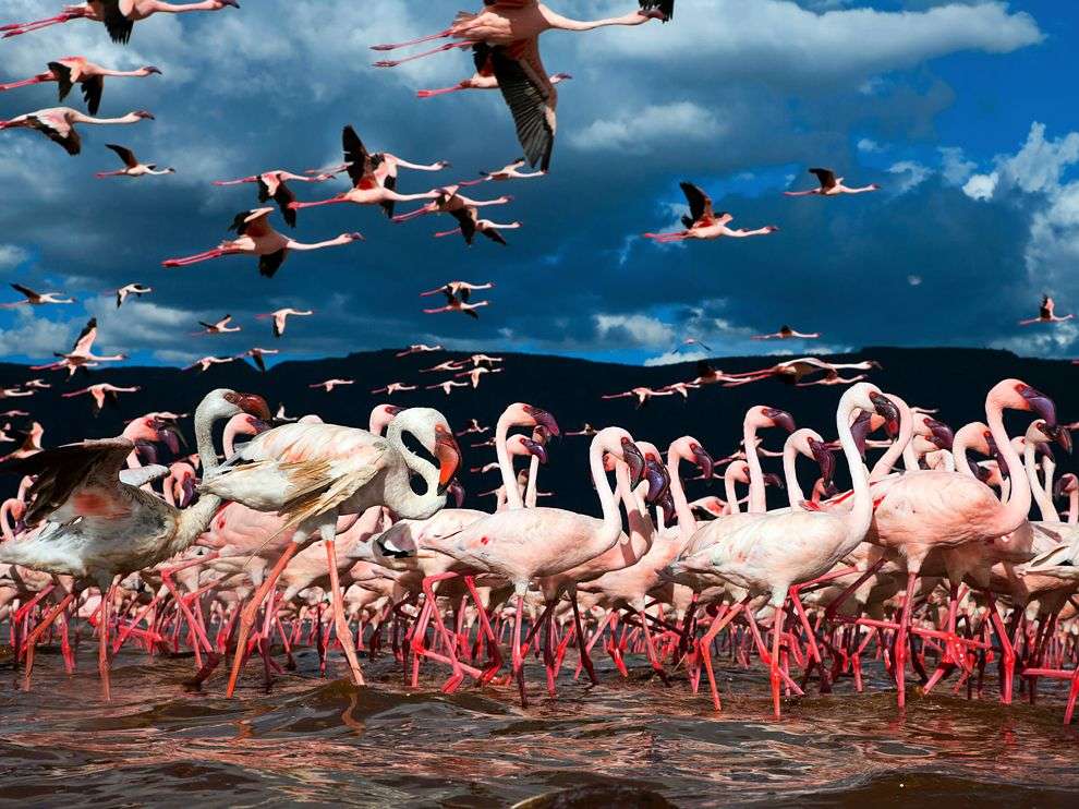 東非大裂谷還是一座巨型天然蓄水池,非洲大部分湖泊都集中在這里,大大小小約有30來(lái)個(gè),例如阿貝湖、沙拉湖、圖爾卡納湖、馬加迪湖、馬拉維湖、坦噶尼喀湖等。這些裂谷帶的湖泊,水色湛藍(lán),遼闊浩蕩,千變?nèi)f化,不僅是旅游觀光的勝地,而且湖區(qū)水量豐富,湖濱土地肥沃,植被茂盛,野生動(dòng)物眾多,大象、河馬、非洲獅、犀牛、羚羊、狐狼、紅鶴、禿鷲等都在這里棲息。坦桑尼亞、肯尼亞等國(guó)政府,已將這些地方辟為野生動(dòng)物園或者野生動(dòng)物自然保護(hù)區(qū),比如,位于肯尼亞峽谷省省會(huì)納庫(kù)魯近郊的納庫(kù)魯湖,是一個(gè)鳥類資源豐富的湖泊,共有鳥類400多種,是肯尼亞重點(diǎn)保護(hù)的國(guó)家公園。在結(jié)眾多的鳥類之中,有一種名叫弗拉明哥的鳥,被稱為世界上最漂亮的鳥,一般情況下,有5萬(wàn)多只火烈鳥聚集在湖區(qū),最多時(shí)可達(dá)到15萬(wàn)多只。當(dāng)成千上萬(wàn)只鳥兒在湖面上飛翔或者在湖畔棲息時(shí),遠(yuǎn)遠(yuǎn)望去,一片紅霞,十分好看。
