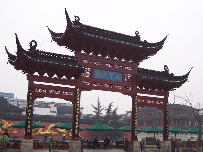 秦淮河是古老的南京文化淵源之地,而內(nèi)秦淮河從東水頭至西水關全長4.2公里的沿河兩岸,從六朝起便是望族聚居之地,商賈云集,文人薈萃,儒學鼎盛,素有“六朝金粉”之譽。自六朝至明清,十里秦淮的繁華景象和特有的風貌,曾被歷代文人所謳歌。 夫子廟位于秦淮河北岸,原是祀奉孔子的地方,始建于宋代景祐元年(公元1034年),是就東晉學宮舊址擴建而成。元代為集慶路學,明代為應天府學,清代將府學 遷至城北明國子監(jiān)舊址,這里便成為江寧、上元兩縣縣學。咸豐年間毀于兵火,同治八年(公元1869年)重建??谷諔?zhàn)爭時被日軍焚毀。古時立學必祀奉孔子,其各地的孔廟,屬于國家祀典內(nèi)容之一。所以孔廟的特點是廟附于學,和國學、府(州)縣學聯(lián)為一體。廟的位置或在學宮的前部,或偏于一側(cè)。