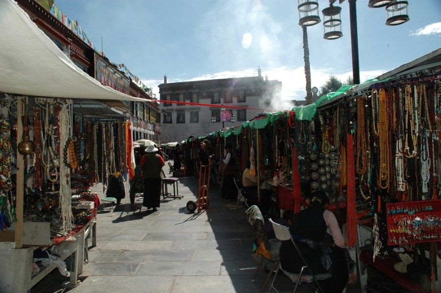 直到解放前,八角街的外圍還算比較寬敞,貴族們的官邸都建在八角街的外圍。但那時,八角街卻早已是包羅萬象、無所不有的拉薩社會生活的縮影了。從街面上看,這里到處是高聳的一幢挨一幢的藏式樓房,這些樓房中有的是白墻紅頂,顯得氣派宏大;有的披滿灰塵,墻體歪斜,顯得簡陋。那時,八角街里既有噶廈政府、地方法庭、監(jiān)獄等機構,又有商店、攤點、手工作坊。這里住著貴族、僧人、學者,也住著木匠、銀匠、鐵匠、畫匠、裁縫等手藝人和平民。這些人在無數(shù)的小貨攤、小帳篷底下,或在一間挨一間的向里伸展進去的小店中,進行著各式各樣、豐富多彩的交易。在八角街的手工作坊里,人們還生產(chǎn)出氌氆、地毯、藏被等生活用品。這里是西藏商品、物資的集散地,也是西藏民族文化的“百科全書”。八角街轉經(jīng)道編輯八角街轉經(jīng)道是藏族群眾心中最重要的一條轉經(jīng)道,藏語意為“中圈”,是相對于“林廓”和大昭寺內(nèi)的“囊廓”而言。傍晚轉經(jīng)的特定時間一到,那些互不相識的人們-有來自藏北牧區(qū)穿白袍的,有來自康巴山地盤英雄結的,還有住在八角街區(qū)、衣著亮麗的……總之,各式各樣的信徒,象是突然接到了一項無聲的命令,在使人猛然感到一陣騷動之后,便開始嚴格地按順時針方向沿著這條環(huán)形路走下去。八角街內(nèi)的古跡編輯圍繞著八角街的轉經(jīng)路有許多古跡。在環(huán)形路與公路交叉的道口上,曾經(jīng)豎立著一個高高的名叫“覺牙達金”大法輪柱。藏族姑娘年滿十六歲,就要到覺牙達金大桅桿前舉行一個慶賀成年的儀式。沿著轉經(jīng)路走,在八角北街24號院子里,有一幢看起來很普通的兩層高的小樓名字叫“曲結頗章”,就是赫赫有名的“法王宮”,是四大宮殿中的第一座,也是八角街的第一所房子。它是在修建大昭寺之前,松贊干布為自己建造的一個簡樸的行宮。從八角北街24號出來,繼續(xù)前行,人們會在白色的香塔前發(fā)現(xiàn)一處開闊的小廣場。那小白塔過去是專門為財神爺燒香的,它保佑著在香塔四周做買賣的生意人。