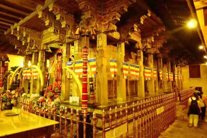 每層小金塔內(nèi)藏著各國佛教徒供奉的珍寶,最后一個(gè)小金塔不到1米高,塔頂飾有一枚鉆石,塔里有一朵金蓮花,花芯有一玉環(huán),長約5厘米的佛牙就安放在這玉環(huán)的中間。每日早、中、晚3次在震懾人心的鼓樂聲中,由3位高僧,分持3把不同的門匙開啟內(nèi)殿大門,進(jìn)入內(nèi)殿,版權(quán)所有山東聊城聊之旅國際旅行社有限公司,轉(zhuǎn)載必究!舉行隆重的敬拜儀式,儀式之后再開啟內(nèi)殿拱門,讓信徒與游人從門外魚貫瞻仰供奉佛牙的佛牙塔。佛牙寺四周有高墻圍繞,圍墻四角各建有一廟,即納特(觀音)廟、摩訶廟、卡多羅伽摩廟和帕蒂尼女神廟,據(jù)說這4座廟是為了保護(hù)佛牙建立的。