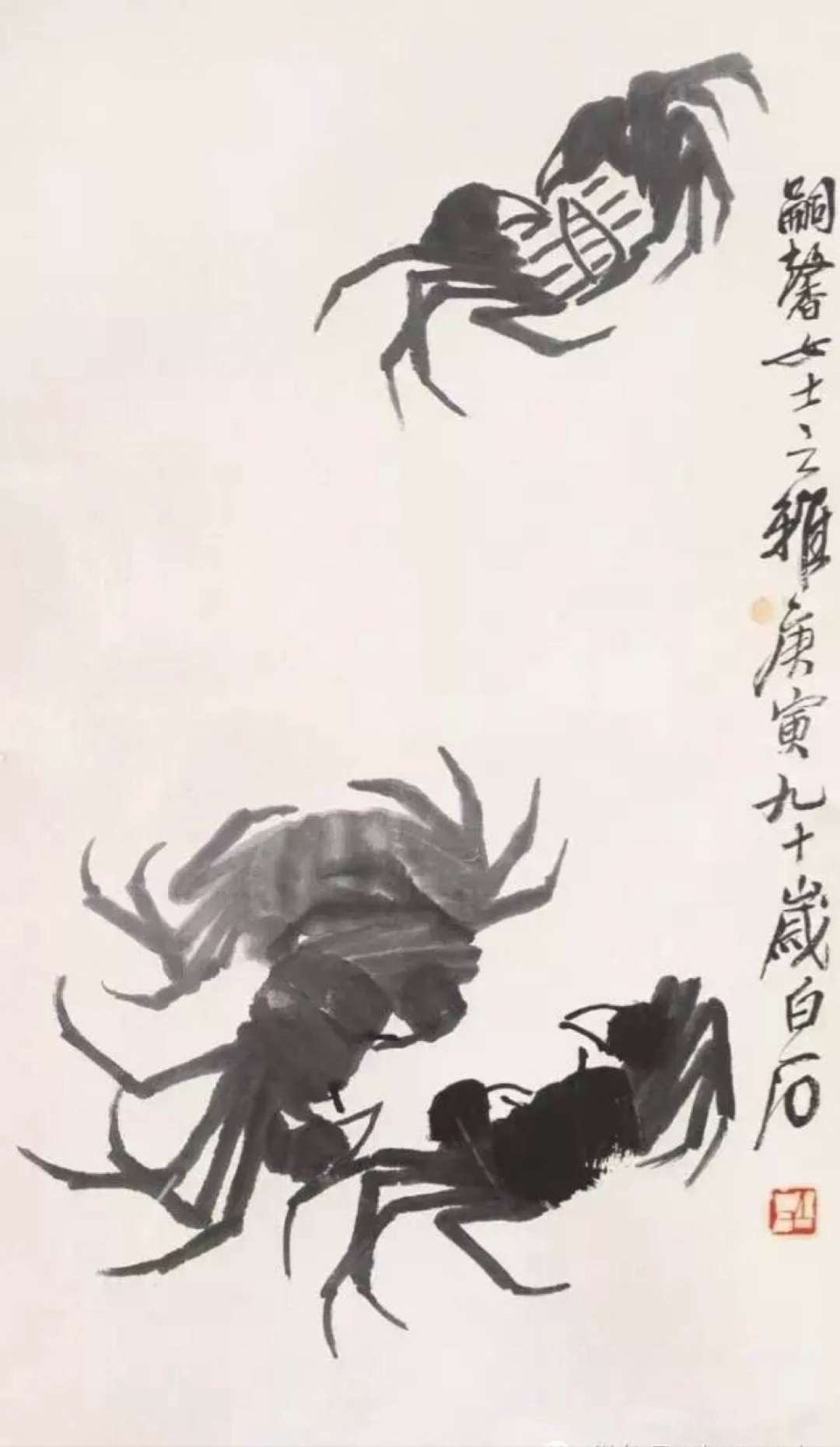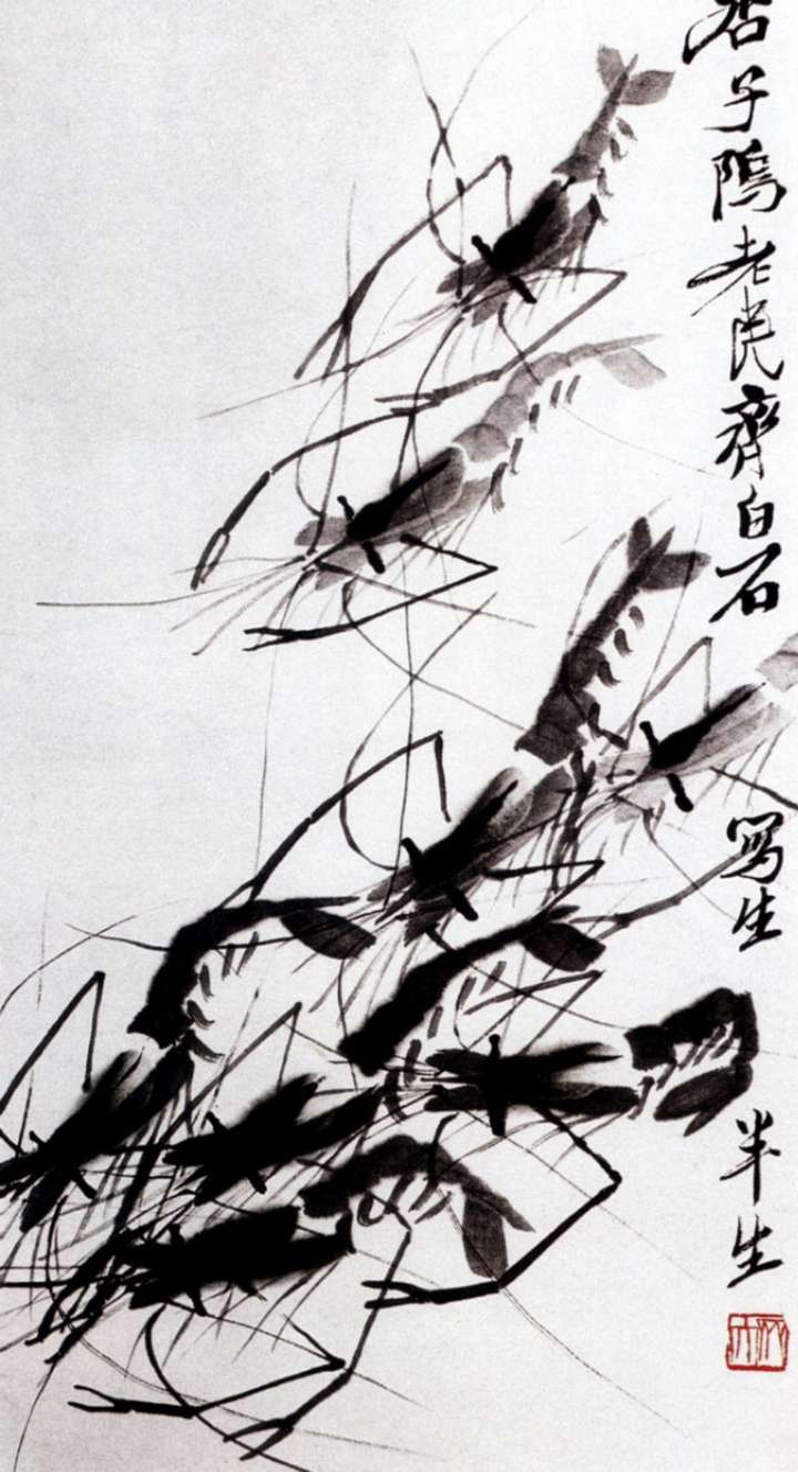 齊白石擅作花鳥蟲魚。畫的蝦更是出神入化,濕漉漉的,宛在水中,靈動活潑,神韻充盈。為了畫得逼真,他在一只大海碗里,養(yǎng)了幾只活蝦,放在案頭。作畫之前,先盯上半天,仔細(xì)觀察它們的體態(tài)、顏色、爭斗時的姿態(tài)。然后,研磨鋪紙,作起畫來,不僅把蝦的身體結(jié)構(gòu)表現(xiàn)得細(xì)致入微,而且把蝦身體的彈性都表現(xiàn)得充滿力量,其長螯的勁力和觸須的柔順處理得相映生輝。蝦眼和蝦腦上的重筆,干濕用得更是恰到好處,令人叫絕。