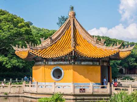 蓮花池三面環(huán)山,四周古樟參天,每年六月蓮花盛開,池中樹影、亭影、橋影倒映,構(gòu)成一幅美妙的圖畫。夏夜入靜,荷香沁人,池中銀花伴月影,形成普陀山十景之一——“蓮池夜月”,令人流連忘返。普濟(jì)寺占地37019平方米,共有10殿、12樓、7堂、7軒,計(jì)23l間,建筑面積11400平方米。全寺有六進(jìn)殿堂,自南向北貫串在一條中軸線上。山門。面寬五間,重檐歇山,正山門平時(shí)關(guān)閉,僧人游客均從東山門出入。僧人圓寂后由西山門出寺。