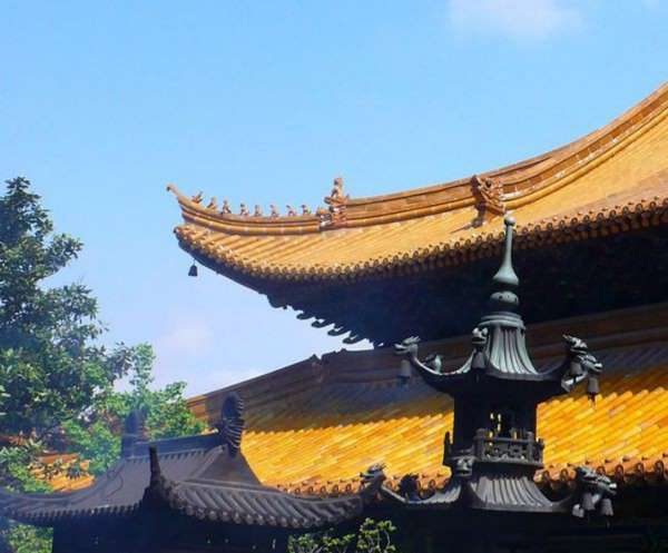 天王殿。亦稱金剛殿,面寬五間,進(jìn)深四間,重檐歇山。進(jìn)門迎面是一彌勒菩薩,光首、笑臉、袒胸、盤坐,一手拿一只布袋。據(jù)說他能將世人一切苦難裝入布袋之中。佛像兩旁有一副對(duì)聯(lián):“慈顏含笑笑天下之可笑之人,大腹可容容世間難容之事”,以勸人們慈悲大度為懷,用樂觀態(tài)度對(duì)待風(fēng)雨變幻的生活。彌勒菩薩后面的塑像是韋馱菩薩,昂然挺立,手持寶杵,據(jù)傳韋馱是神將之首,常于東、南、西三州巡游,守護(hù)伽藍(lán),屬護(hù)法神。兩旁的四大天王宛如四名衛(wèi)士在維護(hù)法門,他們是東、南、西、北四個(gè)方面的天王,各自手里拿著法器。殿后有香樟8株,直徑0.8-2米多,植茂蓋庭。