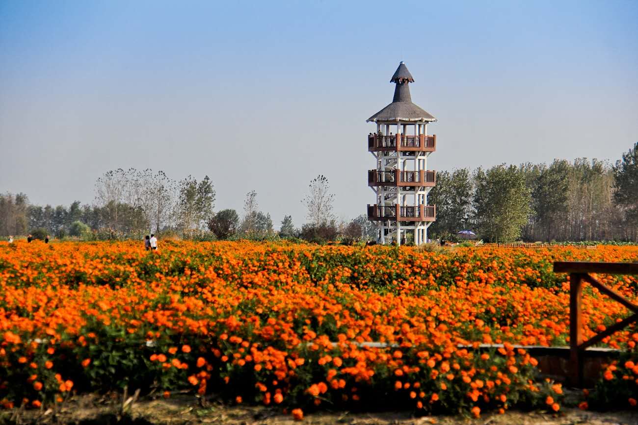 在每年秋季,千垛景區(qū)上長滿了萬壽菊,因此有了”春看菜花秋賞菊‘的絢麗畫面。