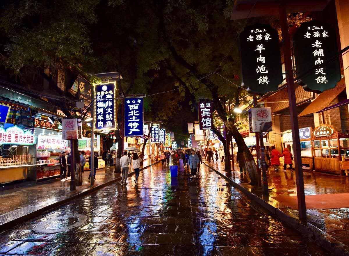 晚上的回民街有著與白天不同的精彩,整條街被濃厚的市井氣息籠罩,道路兩旁遍布掛著電燈、汽燈的各種攤鋪,主要販賣糕餅、干果、蜜餞、小吃。這些小攤后面則是許多經(jīng)營當(dāng)?shù)仫L(fēng)味小吃的飯館,人多時不光店里人