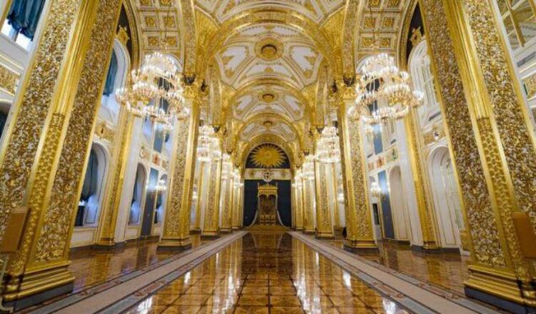 大克里姆林宮是克里姆林宮中的主要建筑之一。克里姆林宮墻內(nèi),朝向莫斯科河有三列高窗的漂亮建筑物就是大克里姆林宮,1839~1849年在舊宮原址上建造,由古老的安德烈夫斯基大廳和阿列克山德洛夫斯基大廳聯(lián)結(jié)而成。大克里姆林宮外觀為仿古典俄羅斯式,廳室全部建筑式樣多樣,配合協(xié)調(diào),裝潢華麗。宮殿的正中是飾有各種花紋圖案的閣樓,上有高出主建筑物的紫銅圓頂,達(dá)13 米,并立有旗桿,節(jié)假日則升國旗。大克里姆林宮內(nèi)部呈長方形,樓上有露臺(tái)環(huán)繞的總面積達(dá)2萬平方米的700個(gè)廳室。從前,第一層除了處理政務(wù)的處所以外,全是沙皇私人宮室,白色寬闊的樓梯通往二層各廳,這里有格奧爾基耶夫大廳、弗拉基米爾大廳和葉卡捷琳娜大廳,從前還有安德烈耶夫大廳,曾是沙皇接見使臣的地方。格奧爾基耶夫大廳是大克里姆林宮中最為著名的殿廳,是俄羅斯工匠巧奪天工的建筑杰作。大廳呈橢圓形,圓頂上掛著6個(gè)鍍金兩枝形吊燈。每個(gè)吊燈重1300千克,圓頂和四周墻上繪有15~1 9世紀(jì)俄羅斯軍隊(duì)贏得勝利的各場戰(zhàn)役的巨型壁畫。大廳正面有18根圓柱,柱頂均塑有象征勝利的雕像。如今,格奧爾基耶夫大廳是政府舉行歡迎儀式的傳統(tǒng)地點(diǎn)。