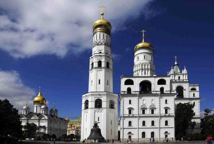 人們從遠(yuǎn)處遙望克里姆林宮,不難發(fā)現(xiàn)有一座建筑高高地矗立在建筑群體中,有鶴立雞群之感。這個(gè)高大建筑就是教堂廣場上的伊凡大帝鐘樓。它高81米,是古時(shí)的信號(hào)臺(tái)和望臺(tái)。鐘樓的左側(cè)有重達(dá)40 噸的炮王,右側(cè)是著名的鐘王。這兩個(gè)龐然大物雖然從未使用過,但卻顯示出了俄羅斯工匠高超的鑄造技術(shù)。