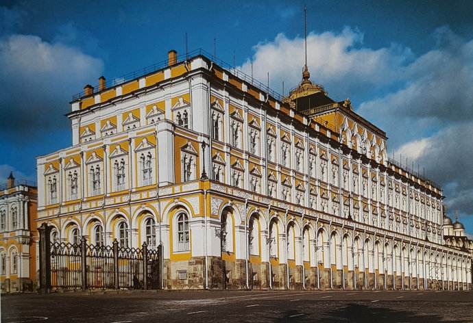 1838年,大克里姆林宮重建,全部由俄羅斯工匠采用本國建筑材料建成,外表看是三層建筑,實(shí)際是兩層,第一層向前突出,構(gòu)成一個(gè)露天陽臺(tái),后來作為蘇聯(lián)政府、蘇共中央和社會(huì)團(tuán)體舉行會(huì)議的場所。