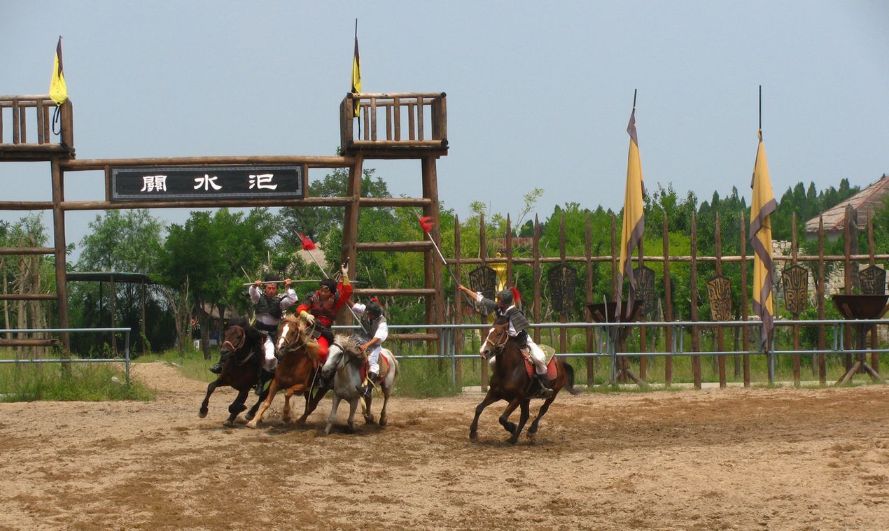 演武場總面積3600平方米,配有專業(yè)演員100余人,優(yōu)良的新疆伊利馬40多匹。演員都是參加過電影《英雄》、電視劇《七劍下天山》的馬技替身演員,馬匹也都是訓(xùn)練有素的名馬良駒。為游客獻(xiàn)上以西周歷史為背景的大型古代馬戰(zhàn)節(jié)目-王城保衛(wèi)戰(zhàn),和技術(shù)精湛、情節(jié)驚險(xiǎn)刺激的馬術(shù)特技表演。觀看馬戰(zhàn)表演、馬術(shù)特技之余,游客還可以親身體驗(yàn)縱馬奔馳、馳騁沙場的英雄氣概,和乘坐戰(zhàn)車巡城點(diǎn)兵、號令天下的王者風(fēng)范。