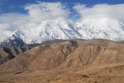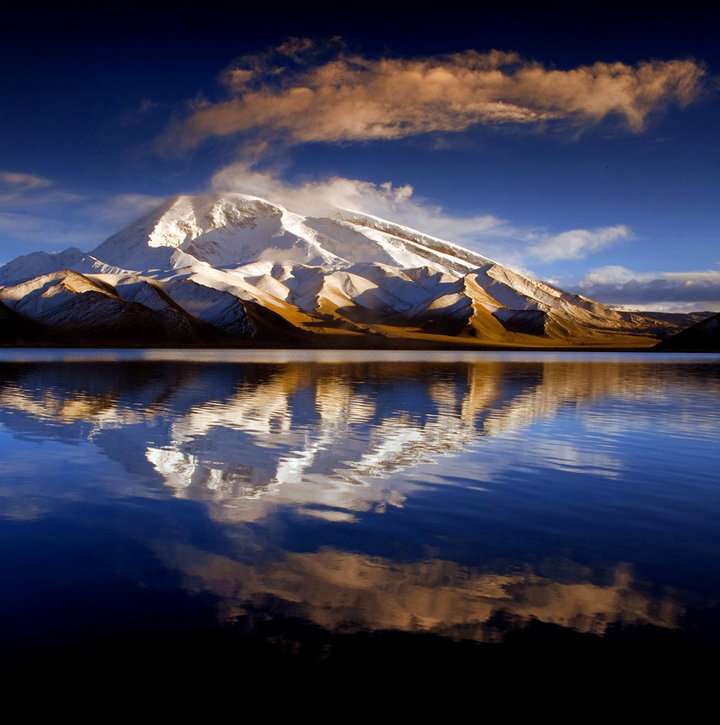 公格爾峰位于新疆克孜勒蘇柯爾克孜自治州阿克陶縣,為昆侖山的高峰之一,海拔7649米。山頂常年積雪,山間懸掛著條條銀光閃閃的冰川,極為壯觀。