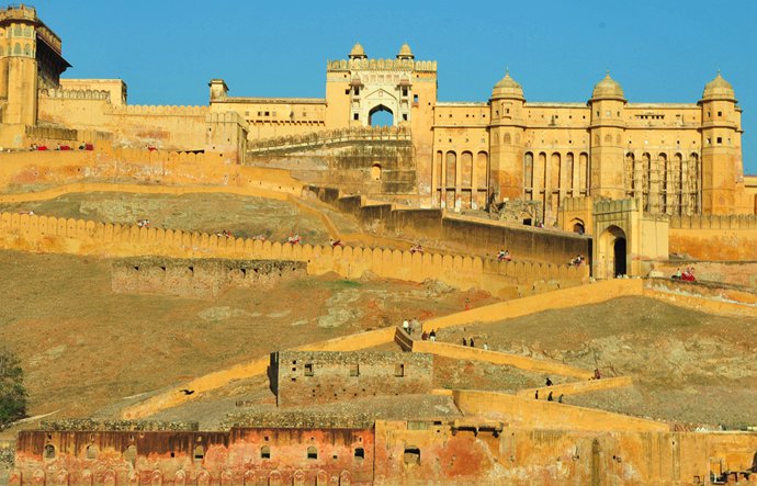 坐落在齋普爾的琥珀山山坡上的一座土黃色城堡,含比較濃厚的伊斯蘭教建筑風(fēng)格,歷史上印度曾長期定都于此,古堡依山傍河而建,由眾多獨立宮殿組成,其中有著名的Sheesh Mahal(鏡宮)和Jaigarh(杰加爾堡)。