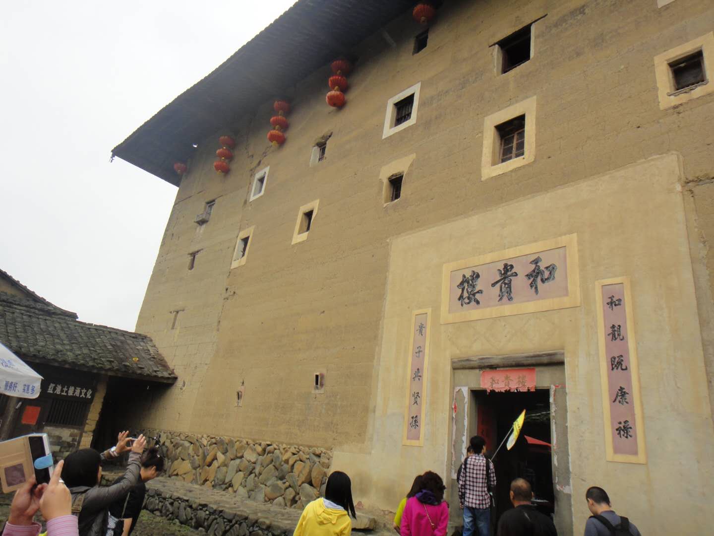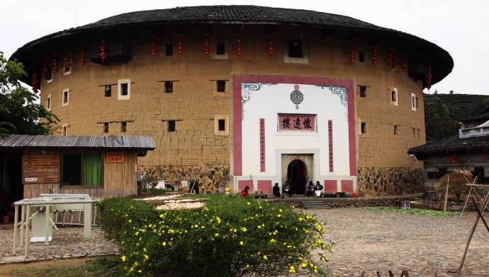 和貴樓每層有28個(gè)房間,共有140個(gè)房間。樓正中開一個(gè)大門,東西南北四方各有樓梯上下。它建于清雍正十年(1732年),據(jù)說當(dāng)初選址建樓,開始并未發(fā)現(xiàn)這是塊沼澤地,樓建了一層,忽然整層樓像沉船一樣,慢慢下沉到了爛地里,建樓的簡姓族人無可奈何,只好在下沉的樓墻上打了100多立方米的排樁,他們覺得地基這下牢固了,就從頭開始夯墻,建起了一座五層高的方樓。他們似乎很有把握,從不擔(dān)心大樓會(huì)傾斜或者下沉,果然兩百多年來,和貴樓固若金湯,風(fēng)雨不動(dòng)安如山?,F(xiàn)在,你在樓中學(xué)堂的小天井用鐵線往地