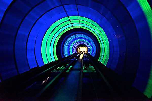 外灘觀光隧道通過聲、光、電、激光等高科技手段,在直徑僅6.76米、長646.7米的圓隧道內(nèi)制作五光十色的動態(tài)景觀。雖然過江時間只有5分鐘,但游客將經(jīng)過八個景色不同、內(nèi)涵各異的景區(qū)。首先經(jīng)過的是“時光隧道區(qū)”。