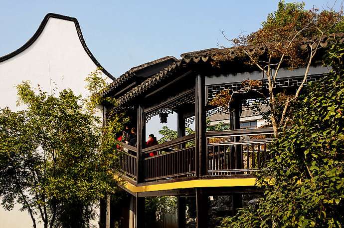 園中有書齋二處,分別以友于和海棠為名,尤其友于書屋,地處幽偏,經(jīng)曲折長廊,過清蔭居和靜中觀,方可蜿蜒而至。友于書屋為自成一體的獨立庭院,前院湖石數(shù)片,花木扶疏,室內(nèi)經(jīng)典古籍,書香飄溢,實在是一個專心攻讀的“藏修密處”。在嚴家花園幽曲靜美的環(huán)境中,友于書屋等建筑偏居一隅,清幽曲奧,具有幽人般的情致;與其迥然有異的是,另有一些建筑如眺農(nóng)樓、見山樓、環(huán)山草廬、宜人亭、延青閣等則地處高曠,空間暢豁,具有曠士般的襟懷。憑欄極目,不但園中景致盡收眼底,還可看到園外的田野風光和靈巖山的滿目蒼翠。延青閣上一副對聯(lián)概括了這一切:“閣鄰佛寺經(jīng)盈耳,窗對靈巖翠滿晴”。嚴家花園還有一些建筑造型頗為別致,在蘇州古典園林中頗為罕見。如延青閣后墻與圍墻不在一線,陡然偏斜出一角,打破了平穩(wěn)板律的局面,使人產(chǎn)生無限遐想。聞木樨香堂為廳榭合一式建筑,前部水榭依水而筑,數(shù)魚為樂,后部四面廳光明洞徹,盡收四周景色于窗欞之內(nèi)。羨園東部的爬山廊也較罕見,此廊依地勢而建,隨地形升高,連接自然,造型優(yōu)雅,使人在不知不覺中從平地漫步至環(huán)山草廬的二樓。