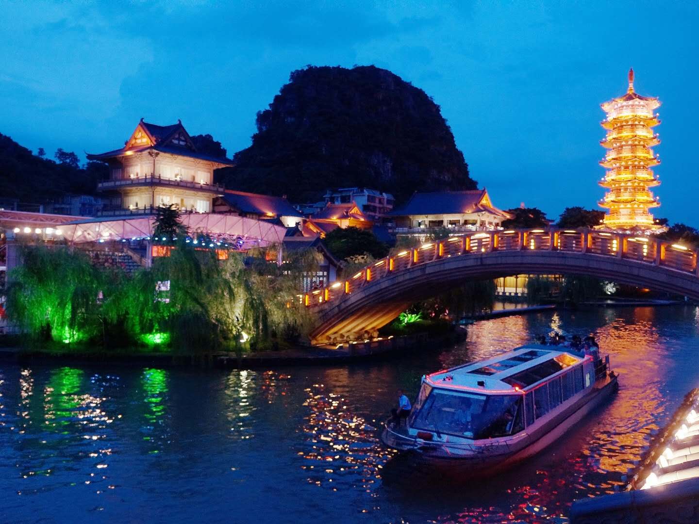 桂林的木龍湖,以前沒有的,為了兩江四湖環(huán)城水系,人工造了這個(gè)湖,漓江的水就是從這里流進(jìn)桂林市的,有了木龍湖,桂林市更美,桂湖、榕湖、杉湖的水活,清了,也更有魅力。木龍湖位于桂林市中山北路,是兩江四湖中建筑最別具一格的一段湖面,它是在老城墻東門城的依托下,參照清明上河圖等很多宋朝時(shí)期建筑改建而成的。由于后期建筑價(jià)格昂貴,也是四湖中唯一一處要買票進(jìn)入的湖面。木龍湖的位置,在宋代是一排排的兵營(yíng),這個(gè)人工湖因?yàn)猷徑君埗?,故名木龍湖,木龍塔是以上海宋代的龍華塔為藍(lán)本建造的,高45米。木龍湖這個(gè)湖是兩江四湖里最小的一個(gè),但是景色毫不遜色。極為美麗。