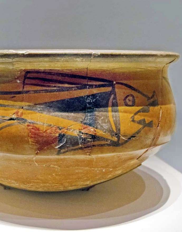 魚紋彩陶盆的盆口沿微卷,通體施以紅色,盆的外壁描繪互相追逐的游魚三尾。魚的線條流暢,比例準確,形態(tài)為圓睜的眼睛和大張的嘴巴。