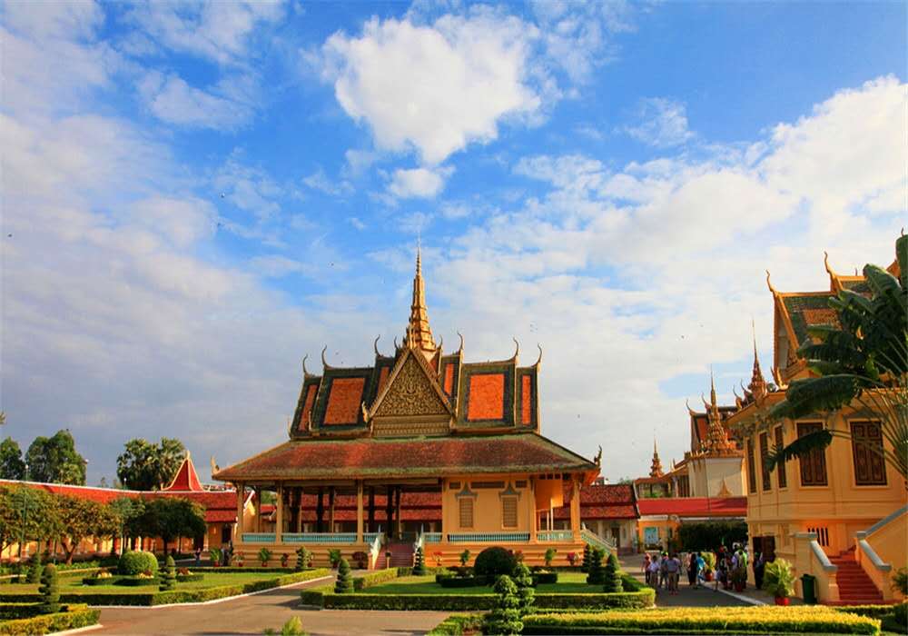 金邊王宮(RoyalPalace)也稱四臂灣大王宮,因位于上湄公河、洞里薩河、下湄公河與巴薩河的交匯處而得名,是諾羅敦國王于1866—1870年建造的。王宮為長方形,長435米,寬402米,外有城墻。王宮的建筑具有高棉傳統(tǒng)建筑風(fēng)格和宗教色彩,宮殿均有尖塔,代表繁榮;殿身涂以黃、白兩色,黃色代表佛教,白色代表婆羅門教。王宮最初為木結(jié)構(gòu),后改建為水泥結(jié)構(gòu),但保持了原來的風(fēng)貌。王宮內(nèi)主要建筑有: