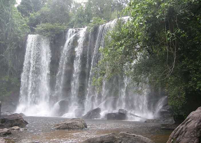在波列昂通寺西南有一著名瀑布,叫荔枝山瀑布,位于暹粒河上游的一個(gè)開闊山谷,山谷左右有茂林修竹夾峙。水簾似的大瀑布沿石壁傾瀉而下,勢(shì)如萬馬奔騰。版權(quán)所有山東聊城聊之旅國(guó)際旅行社有限公司,轉(zhuǎn)載必究!瀑布分為兩節(jié),第一節(jié)約 25 米高,沿著石壁傾注在一塊約1000 平方米的平臺(tái)上。瀑水流過平臺(tái),到了一垛落差約 30 米高的絕崖峭壁上部,從這里再?zèng)_出峭崖,砰然跌落,又形成寬達(dá) 100 米的瀑布,響聲雷鳴,水花四濺,景色極為壯觀。平臺(tái)上分布著 16 個(gè)深淺不同的天然石洞,洞底有一層薄薄的黃沙,游人可以在洞中用瀑水洗澡。