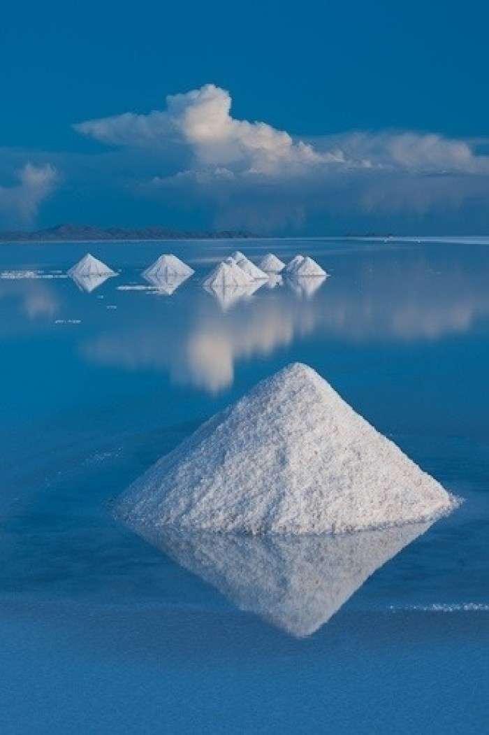在高原南端有一些冰川融化時留下的鹽湖,而在1萬年前最后一個冰期(第四紀冰期)結(jié)束時,湖水已逐漸消失。高原上最大并最令人印象深刻的就是烏尤尼鹽沼(Salar de Uyuni)。每年夏季(雨季12月至次年1月),它被雨水注滿,形成一個淺湖;而每年冬季(旱季7月至10月),湖水則干涸,留下一層以鹽為主的礦物質(zhì)硬殼,中部達6米厚。人們可以駕車駛過湖面。尤其是在雨后,湖面像鏡子一樣,反射著好似不是地球上的、美麗的令人窒息的天空景色,這也就是傳說中的“天空之鏡”。由于面積空曠,極其光滑(覆蓋著淺水),同時又極平整(海拔差異極?。?,地表反射率極高,使阿塔卡瑪成為一個理想的測試和校準地球遙感衛(wèi)星之地。
