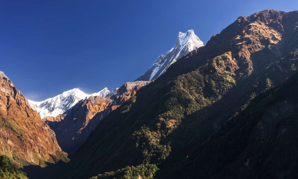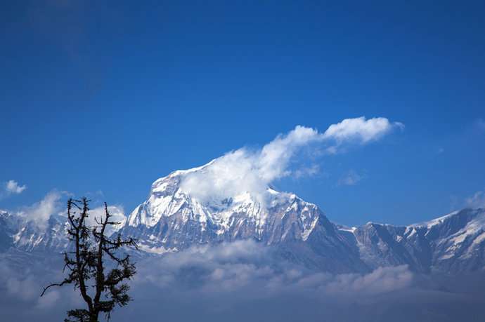 魚尾峰雖然不是尼泊爾最高的山峰,但卻成為尼泊爾的標(biāo)志。從波卡拉的費(fèi)娃湖附近,可以看到這座圣山和周圍峰群,突出于較低的山巒之上。