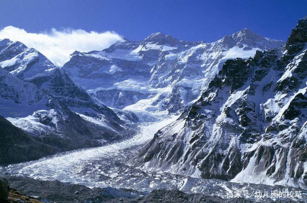 干城章嘉峰山體巨大,有五個(gè)峰頂:干城章嘉主峰,海拔8586米;干城章嘉西峰(又叫雅蘭康峰),海拔8505米;干城章嘉中央峰,海拔8473米;干城章嘉南峰,海拔8476米;康巴秦峰,海拔7903米。其間形成眾多山谷冰川,使得山勢更為險(xiǎn)峻,冰崩、雪崩頻繁出沒。由于處于孟加拉灣暖濕氣流控制區(qū),降水量非常大,冰雪補(bǔ)給充足,東坡的熱姆冰川長達(dá)31公里,面積130多平方公里,它的厚度達(dá)到300米。西坡有雅蘭冰川,西北坡還有干城章嘉冰川和普魯爾冰川。這些冰川流動(dòng)快,冰裂縫較多。這組群峰,受地理位置影響,常常濃云密布,很難露出真面目。