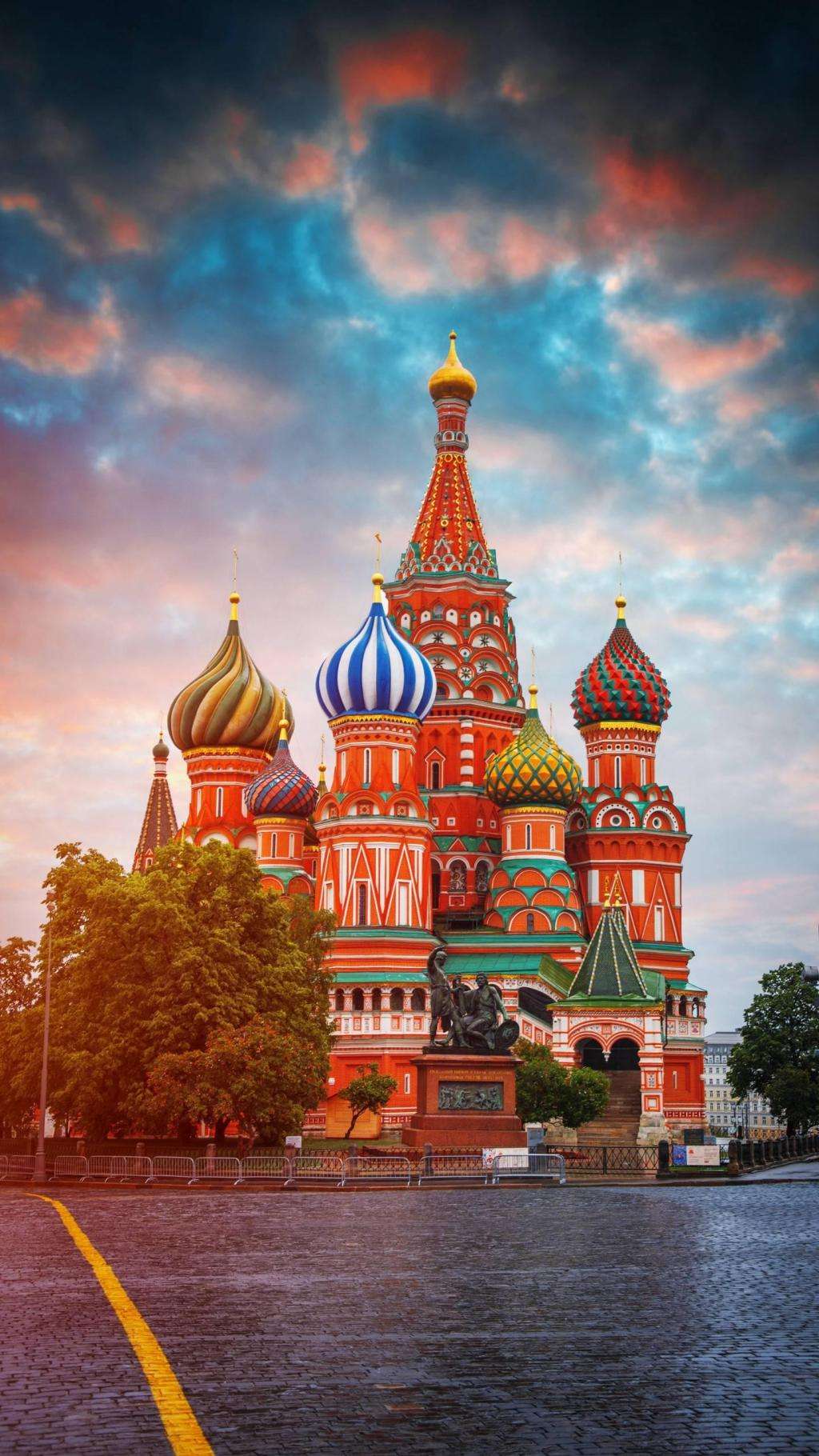 圣瓦西里大教堂于1553-1554年為紀念伊凡四世戰(zhàn)勝喀山汗國而建(由7個木制小教堂組成),并于公元1555年—公元1561年奉命改建為9個石制教堂,造型別致,多奇異雕刻,主臺柱高57米,為當時莫斯科最高建筑。