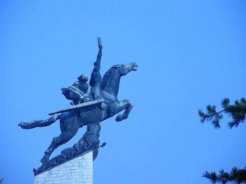 朝鮮千里馬銅像矗立在萬壽臺的丘崗上,是1961年4月 15日,在偉大領(lǐng)袖金日成同志的49壽辰之際建立的。座基是用360多種2,500多塊不同規(guī)格的花崗巖壘起來的,銅像為一匹伸展雙翅的騎有工人、農(nóng)民的 “千里馬”。