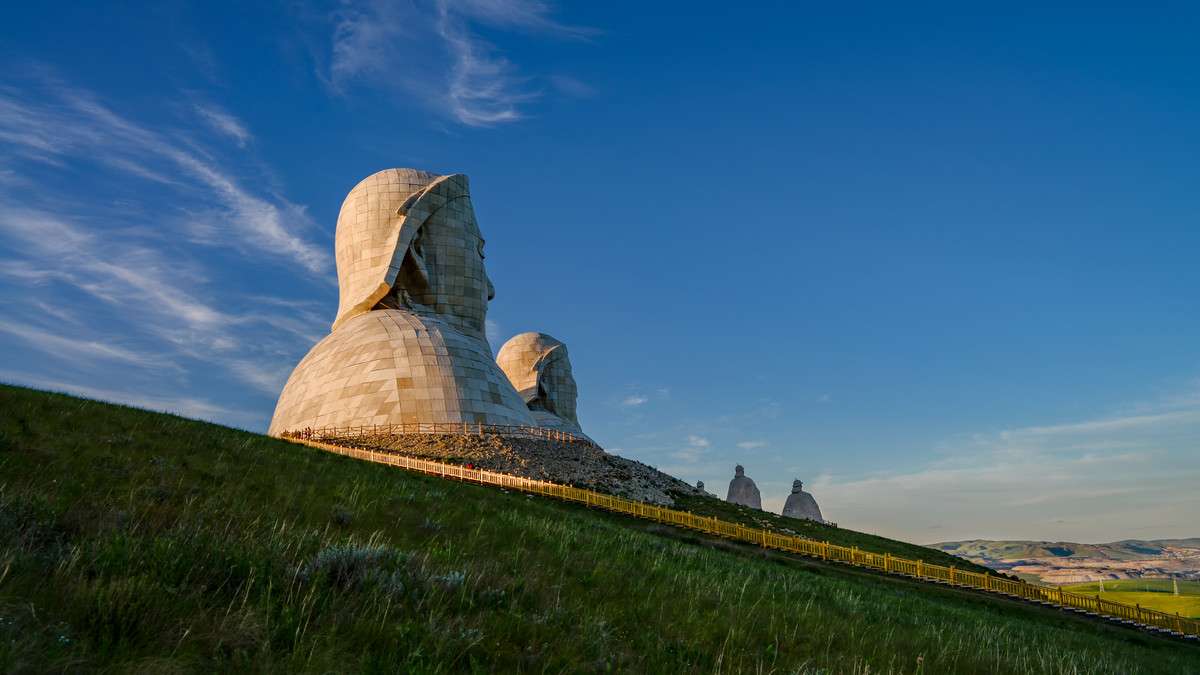 霍林郭勒市可汗山景區(qū)總投資5200萬元,占地面積13000余平方米,景區(qū)由山門、蒼狼之路、蒙元兵陣和蒙古帝王群四部分構(gòu)成,其中成吉思汗頭像雕塑高達50米。