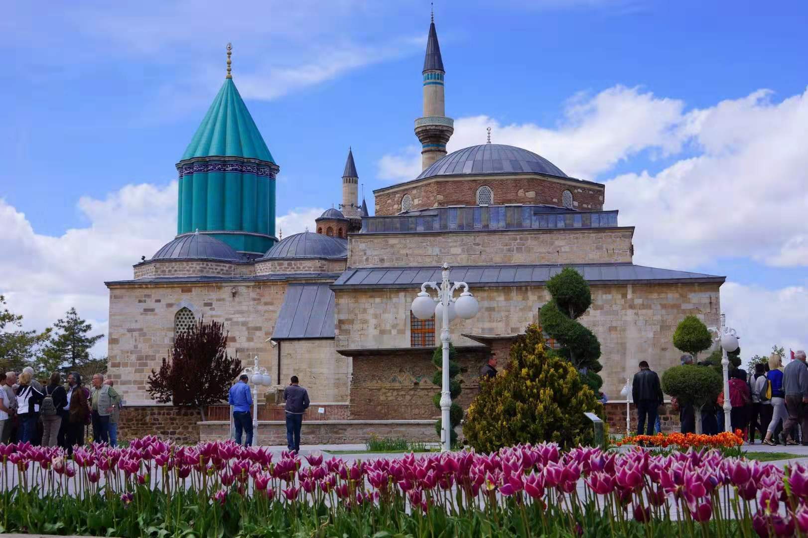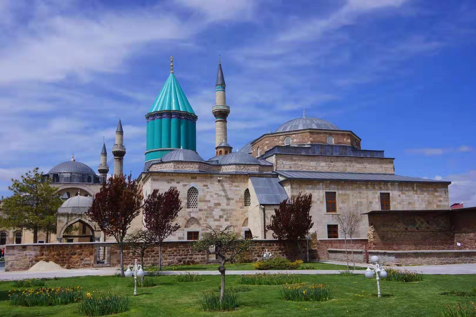梅烏拉那博物館由清真寺改成,是孔亞人的虔誠(chéng)圣地,每日前往參拜的當(dāng)?shù)厝?,無(wú)不圍繞在梅拉那父子陵墓前念念有辭,用黃金刺繡的絲絨覆蓋著的梅拉那父子,是孔亞人最尊敬的人。而在這龐大的清真寺建筑群中,高高低低蓋碗般的屋頂上,突出一個(gè)綠色的高聳尖塔,氣勢(shì)非凡。