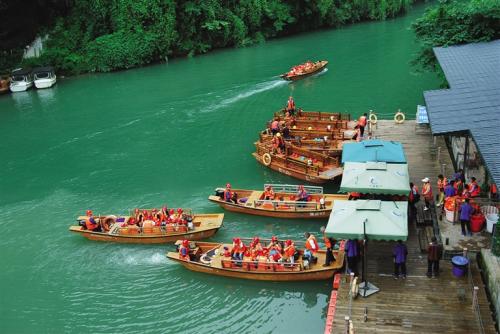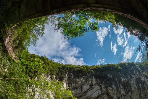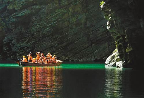 重慶蒲花暗河景區(qū)位于黔江區(qū)蒲花河濯水段,系阿蓬江的一條支流,暗河部分長1公里多,河水最深處達20余米,由蒲花暗河、天生橋群、大漏斗群、絕壁棧道、蒲花河大峽谷等組成,景點有天生三橋、黑龍?zhí)丁⒊嘌?、大峽谷等。