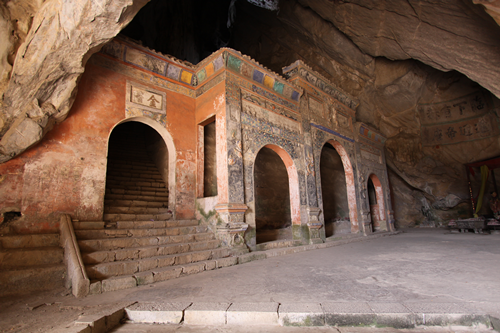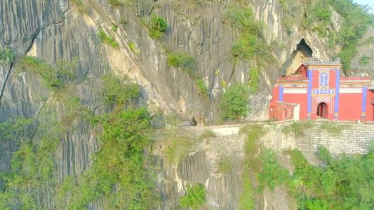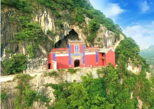 是當(dāng)年蘇元春將息之所。依洞設(shè)景,別有天地。宮門進處,洞廳暢明,石刻滿壁?!肮哦撮L春”其左,“奠麗南邦”其右,書藝精湛,分外醒目。左洞上去,是一道朱門,雕龍刻鳳,氣宇軒昂。額題:“玉闕”。對開耳門,號曰“金階”。巨幅壁刻云,“遙通帝座”。沿“金階”上去,見一座金門,稱為“天闕”。左設(shè)左禁門,右置右禁門。洞府正中,一把巨大的石傘之下,數(shù)株石筍,宛若數(shù)名仙女,簇擁“天帝”。回首身后,一道強光從高遠之處,穿山而下,那湛藍的天穹,恰似一面奪目的寶鏡,陽光就從那里直照到"天帝"的寶座之前。真是奇光天外來,滿洞放異彩。從宮右往“天橋”走去,爬到高遠的洞口,回身展望,又看到一道彩墻,圖案精美,玲瑰透剔,額題“萬物資始”。自此俯瞰山下,清溪如帶,田垌鋪金,村落點點?!氨T獙m”,結(jié)構(gòu)精美,金門重疊,朱戶畫墻,多彩多姿,真是富麗堂皇,勝似蓬萊。洞頂題詩云,“蜿蜒步上九重天,回首山河數(shù)點煙。如今方識保元妙,幾回夢魂到小連”。美妙的“保元宮”,確令游客駐足留連。