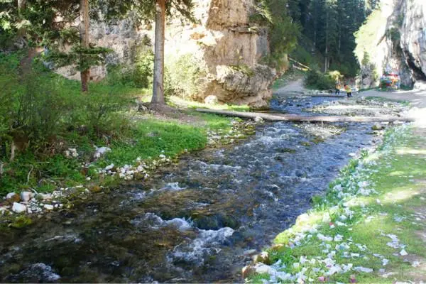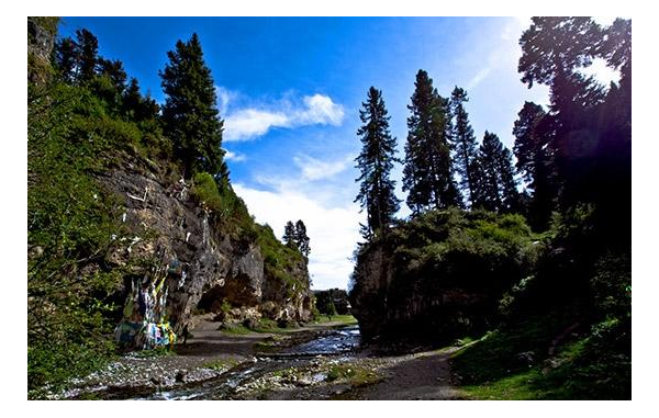 沿湖岸款步前行,越來越窄,轉(zhuǎn)過峽谷就看到小溪的源頭了,源頭從崖兩邊幾眼泉眼中潺潺涌出,清清淺淺地淌在碎石灘下,你不妨喝上兩口,這可是自然界中的純凈水,源頭之水,喝了會讓你感到一股沁人心脾的感覺。當?shù)匕傩展苓@泉水叫“乃溪”(圣水),是白龍江的源頭。此泉冬暖夏涼,天旱不枯,暴雨不澇,四季清澈見底。站在石灘上向左上方看去,在險峻的山坡上有一個洞穴俯視著泉眼,居高臨下,虎踞雄威,這就老虎洞。傳說這峽谷曾住著一條善良的白龍在此修道。有一年,山谷中突然發(fā)生了一場大火,大火蔓延,燃毀了樹林和莊稼,百姓無家可歸。正在修練的白龍見狀,想去拯救百姓,可神靈卻把它困在了巖石下,急得白龍渾身發(fā)抖黯然淚下,兩眼涌出一串串淚珠,淚珠沖破巖石,撲來了大火。從此這兩眼泉水再沒有間斷過,得救的百姓為感謝白龍的4恩德,便把從這泉眼中流出的河取名“白龍江”。從那以后,白龍江兩岸林木茂盛,人畜興旺。然而好景不長,一頭白額大虎常常從森林中出來傷害生靈。人們死的死,逃的逃,非常凄慘。一天,惡虎正在窮追來不及逃散的人們時,空中飄來一位慈祥的“仙女華爾旦納摩”,她用智慧降伏了惡虎,并把老虎關(guān)在石洞內(nèi),讓它日夜守護在白龍江源頭。人們過上了安居樂業(yè)的生活,而仙女“華爾旦納摩”因私自下凡而回不了天庭,就住進了仙女洞。從此這地方便有了“達倉納摩”這個美麗的名字。(藏語中虎穴叫“達倉”,仙女叫“納摩”)。連后來的格爾底寺也有“達倉納摩寺”之稱。