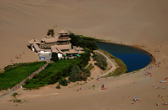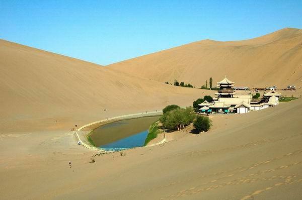 鳴沙山位距敦煌市南郊5公里,因沙動(dòng)成響而得名。山為流沙積成,分紅、黃、綠、白、黑五色。漢稱(chēng)沙角山,又名神沙山,魏晉時(shí)始稱(chēng)鳴沙山。其山東西綿亙40余公里,南北寬約20余公里,沙壟相銜,盤(pán)桓回環(huán)。其特點(diǎn):“峰巒陡峭,山脊如刃;馬踐人馳,殷殷有聲;輕若絲竹,重如雷鳴;沙隨足落,經(jīng)宿復(fù)初?!?/p>