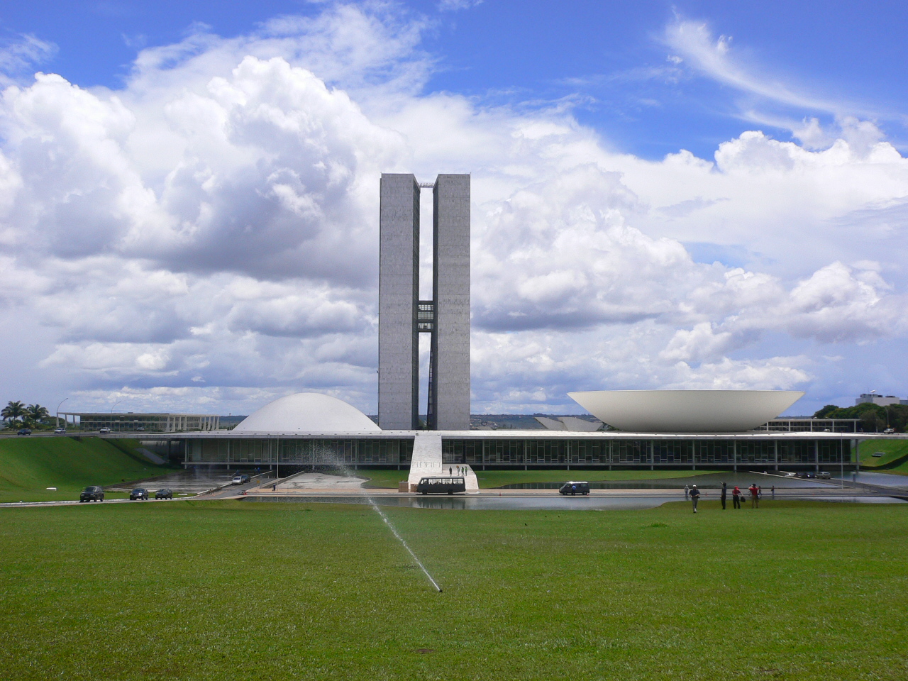 新區(qū)建筑平面布局像一架機(jī)頭向東且有后掠翼的噴氣式飛機(jī),這象征著巴西是迅速發(fā)展中的國家。機(jī)頭部位有三權(quán)廣場(chǎng)、議會(huì)、總統(tǒng)府和最高法院,象征整個(gè)國家的神經(jīng)中樞。機(jī)身前部是18座對(duì)稱的政府各部辦公大樓。議會(huì)大廈由眾參兩院會(huì)議廳和超高辦公樓組成。在廣場(chǎng)的正面是兩棟比肩而立高達(dá)25層的兩院大樓,一邊為參議院,一邊為眾議院,中間用一個(gè)樓道相連,呈“H”形。由于“H”在葡萄牙語中是“人類”一詞的首字母,兩院會(huì)議廳是扁平體,長240米,寬89米,平頂上突出一仰一覆兩個(gè)碗形屋頂,上仰的是眾議院會(huì)議廳,下覆的是參議院會(huì)議廳,分別象征民主和集中。