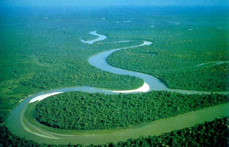 亞馬遜河中游流經秘魯、哥倫比亞、巴西、全長約為2200千米。在巴西北部,亞馬遜河水深45米,河寬3000米,流速緩慢;河中島洲錯列、河道呈網狀分布,兩岸河漫灘寬30~100千米,地勢低下,湖沿密布,排水不暢;河流兩側支流眾多,都發(fā)源于安第斯山東坡,呈羽狀分布。至中游末端,河寬至11千米,河深99米。