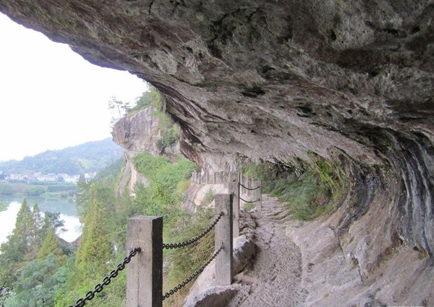 小赤壁 ,倪翁洞向東過溪,絕壁陡峭,東西橫亙長數(shù)里,石壁下部呈赭紅色,猶如焰火燒過,故稱小赤壁。懸崖中有一天然棧道,長數(shù)百米,稱龍耕路,相傳是東漢光武帝劉秀駕龍耕出來的。龍耕路中有丹室、超妙軒遺址,相傳是明吏部天官鄭汝壁和狀元張懋修(張居正三子)隱居之所。小赤壁一帶,溪中有島,島中有湖,恰似蓬萊仙境,還有八仙亭、蓬萊閣等人文景觀。