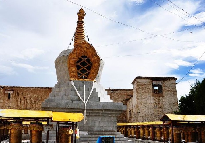 經(jīng)堂四壁遍繪壁畫,有釋迦牟尼傳記、六莊嚴(yán)(即龍樹、圣天、無著、世親、陳那和法稱)、密集金剛、西方有樂世界等題材。經(jīng)堂北側(cè)的羅漢殿(乃登拉康)供奉釋迦牟尼、十八羅漢和四大天王、馬頭金剛(為慈悲觀音的化身)、忿怒神(為佛在降魔除障時顯現(xiàn)的“法身”)等塑像。羅漢殿的東側(cè)是大威德殿(結(jié)幾拉康),主供大威德塑像(格魯派主修的護法神)。據(jù)說這尊神像是釋迦也失特請后藏雕塑家夏艾哇塑的。塑像腹是裝藏有熱羅扎哇的一個拇指,塑完后釋迦也失親自主持了開光誦經(jīng)儀式。大威德神像兩側(cè)共有吉祥天女、六臂依怙神、四臂依怙神、多聞天王、白梵天王等塑像。