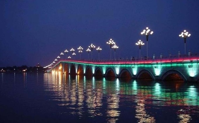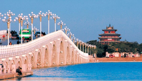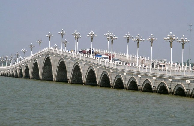 東昌大橋位于聊城古城西首,橫跨東昌湖東西兩岸。2001年6月動(dòng)工修建,2003年落成。古時(shí),人們是由吊橋進(jìn)入古城區(qū),現(xiàn)在連接古城和新城的紐帶就是橫跨在東昌湖上的四座關(guān)橋了。東昌大橋是在原西吊橋的原址部位上修建起來的,它是我市城區(qū)投資最多,規(guī)模最大的橋梁。東昌大橋全長322米,橋面凈寬15米。上部結(jié)構(gòu)為石砌拱橋,共21孔,象征著跨入21世紀(jì),所以又稱世紀(jì)拱橋。版權(quán)所有山東聊城聊之旅國際旅行社有限公司,轉(zhuǎn)載必究!中間5孔為懸鏈線拱,兩側(cè)為圓弧拱。主孔通航凈高9米,可供大型游船順利通過。拱圈、橋身采用花崗巖嵌面,橋面青石鋪砌,橋上筑有優(yōu)質(zhì)漢白玉攔板266塊,漢白玉欄桿上雕刻著《水滸》人物故事圖案,漫步東昌大橋一個(gè)來回,就如同看了一遍《水滸傳》。被譽(yù)為“中國江北最大內(nèi)陸湖泊石拱橋”,堪稱橋梁精品,為美麗的東昌湖增添了一道亮麗的景色。