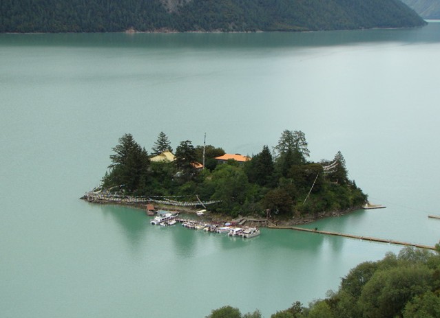 小島上有唐代的建筑“錯(cuò)宗工巴寺”,是西藏有名的紅教寧瑪派寺廟,建于唐代末年,距今已有1500多年的歷史了。錯(cuò)宗寺為土木結(jié)構(gòu),上下兩層,殿內(nèi)主供蓮花生、千手觀(guān)音和金童玉女。寺南有一株桃和松的連理樹(shù),春天時(shí),桃花與青松相映,煞是好看。