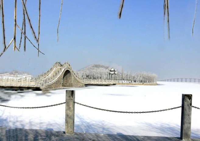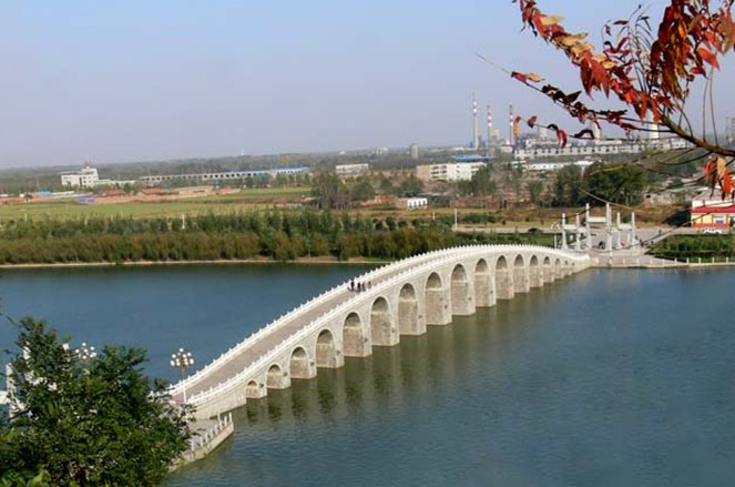 又名十七孔橋,是東阿縣跨度最大的一座橋。由十七個(gè)橋孔組成,總跨度142米,水面高度9.9米,它似一條玉帶,鑲嵌在碧波蕩漾的洛神湖上。