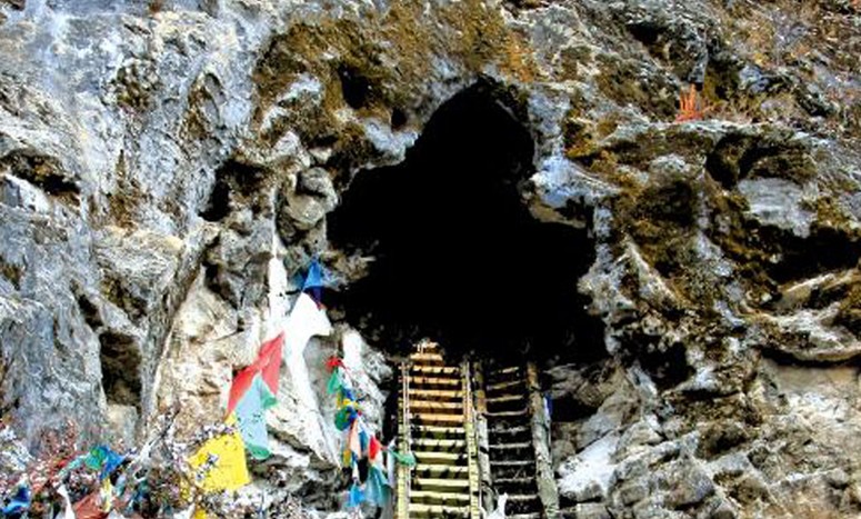如同一堆鋒利的兵器,整個(gè)形態(tài)象度母靜坐。洞口寬約8米,高近2米,洞深40余米,自上而下有自然形成的蓮花生大師、南木朗•多吉堆窘大譯師等六個(gè)修行洞,及自然形成的形態(tài)逼真的米拉日巴、十六羅漢、大象、蝎子、天龍、地蛇、月亮、太陽等80余種畫面。
