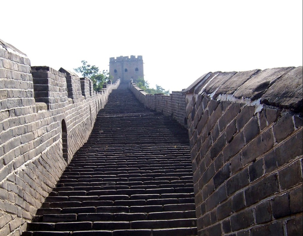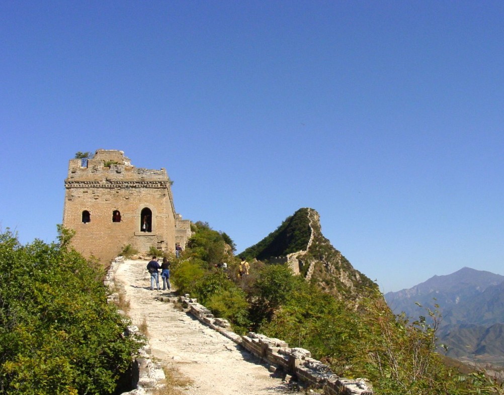 長(zhǎng)城的最高處為“仙女樓”,需登“天梯”而上。天梯高達(dá)100米,坡度85度,幾近垂直,無膽量的絕難征服。仰頭上望,那磚石砌就的臺(tái)階僅可容腳,兩側(cè)懸崖陡壁,中間這一道臺(tái)階細(xì)如線,薄如刃,陡如立,不由人望梯興嘆,倒吸一口涼氣。爬上仙女樓,景色果然更加壯美秀麗,俯首看腳下的懸崖,刀削斧劈一般,幾縷霧嵐掛在絕壁處,更顯得陡峭驚險(xiǎn)。西北邊金山嶺長(zhǎng)城與司馬臺(tái)長(zhǎng)城渾然一體,活象一條即將騰飛的蒼龍。長(zhǎng)城上大小不同、形態(tài)各異的敵樓,恰到好處地建立在各個(gè)制高點(diǎn)上,威風(fēng)凜然,冷峻挺拔。整段長(zhǎng)城,完美和諧,氣勢(shì)磅礴,處處顯示出她的巧妙、奇特、雄偉和壯麗。再看看連綿不斷的燕山山脈奔涌而起,疊起無數(shù)的奇幻;看看遼闊的華北平原無邊無際,一直鋪向目不所及的天邊,在這博大奇異的景色中,令人不由浮想聯(lián)翩。