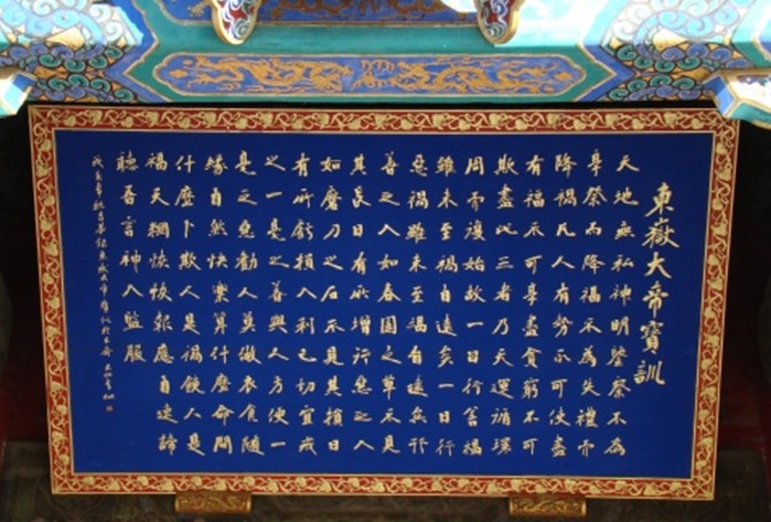 各殿前均掛有楹聯(lián)、匾額,集中體現(xiàn)了東岳信仰懲惡揚善的精髓。楹聯(lián)多是東岳廟的一大特色景觀。原來,廟內多數(shù)殿堂前都掛有白底黑字、小篆字體的楹聯(lián)。它們既是對各殿各司神祇職能的詮釋,也是人們對理想生活的憧憬。在“善惡有報”的外衣下,楹聯(lián)的內容折映出豐富的中國傳統(tǒng)倫理道德觀念。它們或言簡意賅,發(fā)人深?。换蛏钊霚\出,雅俗共賞;或意蘊悠長,蘊含哲理,文化內涵相當豐富。