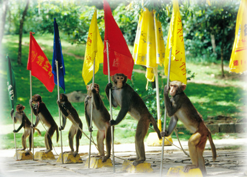 閑庭信步似的從容才是猴子們最為“尊敬”的態(tài)度。正是在這種從容中你已和猴子建立起相互尊重、相互信任的關(guān)系。當(dāng)你做到這一點時,你就不會對在猴藝表演場上人猴同席觀看猴明星的雜技、小品表演的情形嘖嘖稱奇了,同時你也會充分享受到猴子們在你手上、腿上爭食、搶食,嬉鬧的樂趣。