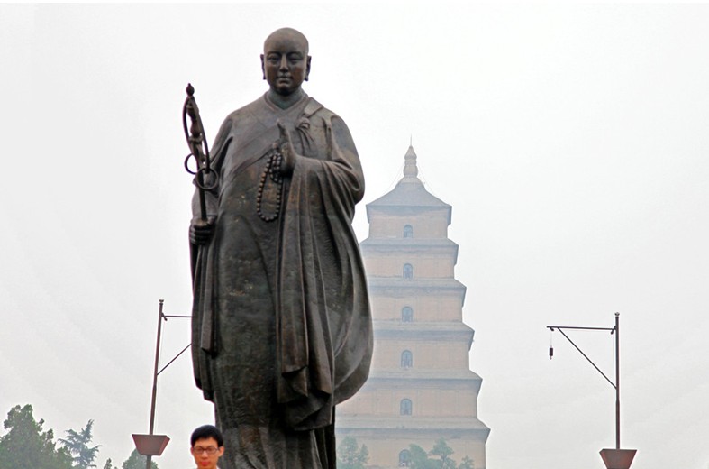 新建的占地20多畝的以玄奘為主題的大雁塔南廣場(chǎng)位于大慈恩寺門(mén)前,廣場(chǎng)中央臺(tái)座上,坐落著一尊高大的唐僧取經(jīng)銅像,花壇錦簇,華燈成行,馬路寬闊,設(shè)施齊備。大慈恩寺大雁塔有著一千多年的光輝歷史,曾有過(guò)輝煌的一頁(yè),據(jù)史書(shū)記載:唐貞觀二十二年(648年),大慈恩寺建成后,皇太子李治恭請(qǐng)玄奘任該寺上座,寺中專為玄奘辟有翻經(jīng)院,供其翻譯佛經(jīng)。為了協(xié)助玄奘譯經(jīng),還特地選擇了50名高僧作為玄奘的助理。玄奘由原來(lái)居住的弘福寺移居大慈恩寺時(shí),舉行了隆重的儀式。玄奘與50名助理乘車,京城僧眾列隊(duì)隨后,文武百官侍衛(wèi)陪同,太宗皇帝與太子李治及后宮嬪妃在安福樓上手持香爐目送,長(zhǎng)安各界人士夾道歡呼。