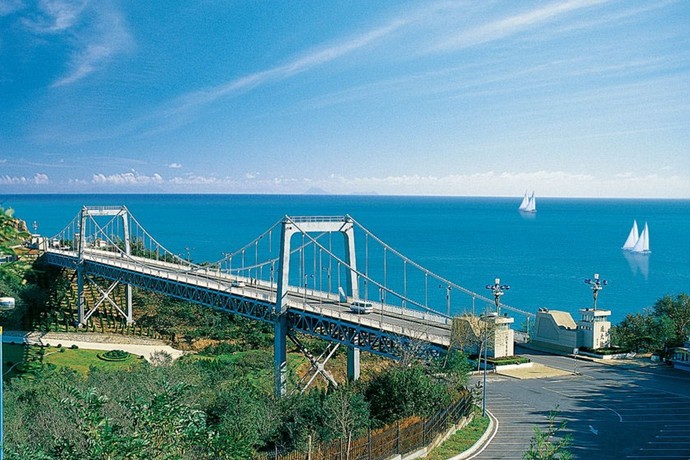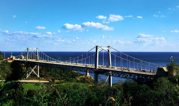 北大橋位于大連海濱風(fēng)景區(qū)中的老虎灘景區(qū)與燕窩嶺景區(qū)之間,是一座近海臨山橫跨山谷的旱橋。它是貫穿整個(gè)大連海濱風(fēng)景區(qū)東西濱海路的要沖,而且也是老虎灘景區(qū)西部和鄰近的燕窩嶺景區(qū)中一壯觀秀麗的風(fēng)景點(diǎn)。 該橋?yàn)槿绾?jiǎn)支加勁桁架懸索橋,全長(zhǎng)230米,中跨跨徑132米,橋?qū)?2米,其中車行道寬為8米。主索矢高13.2米,矢跨比1:10。