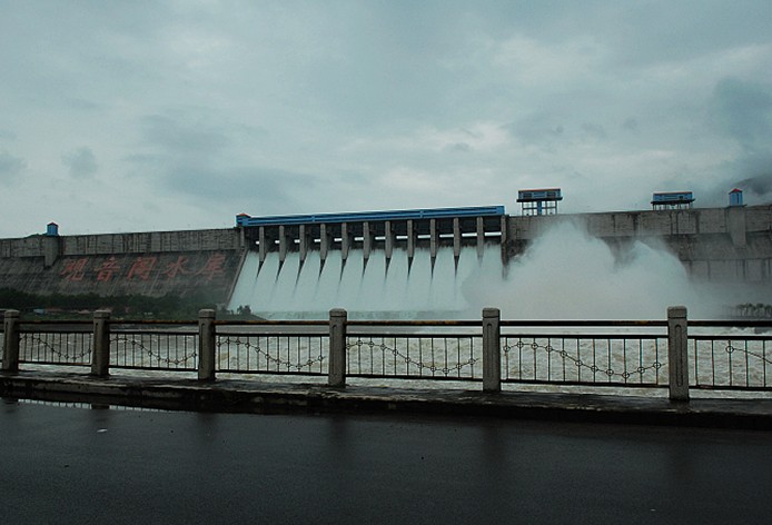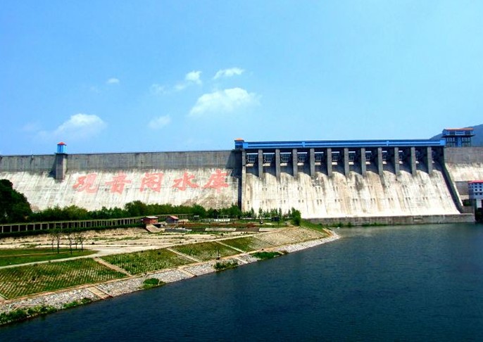 觀音閣水庫是一座以防洪、供水為主,兼有灌溉、發(fā)電、養(yǎng)魚等綜合利用的大型水利樞紐工程。主體工程1990年5月開工,1994年落閘蓄水,2000年11月竣工。工程總投資23.19億元。控制流域面積2795平方千米 。工程為Ⅰ等工程,主要建筑物為1級建筑物,按千年一遇洪水設(shè)計,萬年一遇洪水校核,總庫容21.68億立方米。攔河壩為碾壓混凝土重力壩,共分65個壩段,由攔河壩段、溢流壩段、底孔壩段和電站壩段組成,最大壩高82 米,壩頂長1040 米,寬10 米。
