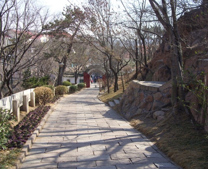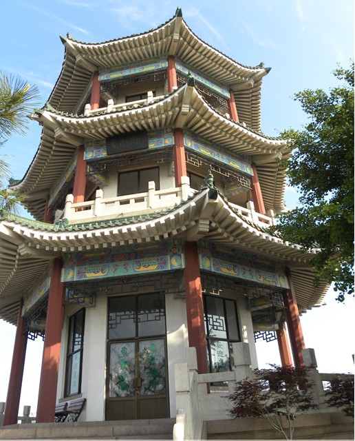 我們從小魚山的大門抬階而上,看到的這個亭子是一個挑檐式的六角亭,在亭內(nèi)可以把碧波蕩漾的匯泉灣一覽無余,故得名“碧波亭”。“碧波亭”的匾額“碧波”二字是由著名的國畫藝術大師吳作人手書的。大家看遠處的山上有三棟紅色蘑菇樓宛如三柄熊熊燃燒的火炬,那是青島市十大山頭公園之一的信號山公園。在半山腰綠樹叢中的那棟別具特色的建筑是青島市迎賓館,原是“德國總督府官邸”。我們再由“碧波亭”拾階而上,站護欄邊可以看到右下邊有兩幢民族式建筑,一座形如城樓,一座貌似宮殿,那就是青島市海產(chǎn)博物館。