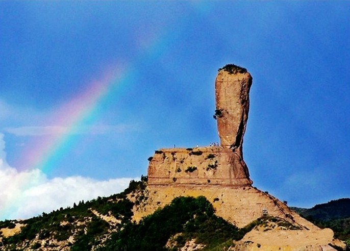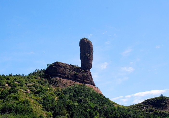 磬錘峰,古稱石挺,俗稱棒槌山。早在1400多年前,北魏著名地理學(xué)家酈道元在《水經(jīng)注》中就有記載,稱其“孤石云舉,臨崖危峻,可高百余仞”。經(jīng)實(shí)際測量,磬錘峰海拔596.29米,槌高38.29米,連同基座高59.42米,上部直徑15.04米,下部直徑10.7米,體積約為6508立方米,重約16205噸,估計(jì)已有300萬年的高齡。峰槌半山腰有一株桑樹,高約3米,大約有300多年的樹齡。